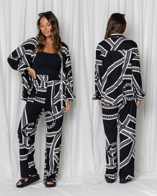 MC021 BLACK SANTORINI CHAIN PRINT SATIN RELAXED FIT L/S SHIRT