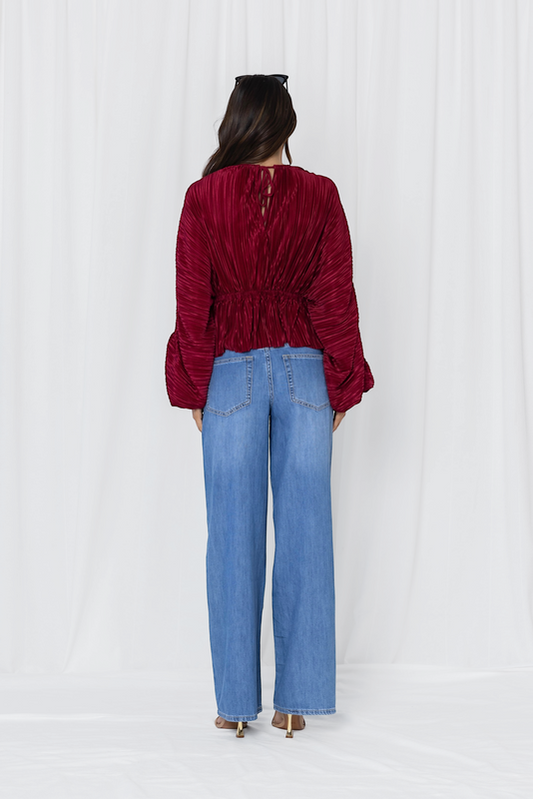 LS526 -WILLA PLISSE BALLOON SLEEVE BLOUSE - WINE