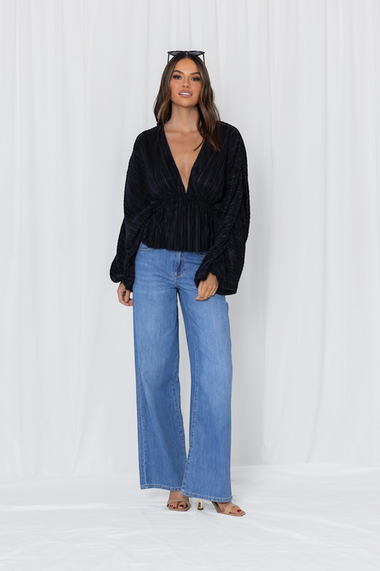 LS526 -WILLA PLISSE BALLOON SLEEVE BLOUSE - BLACK