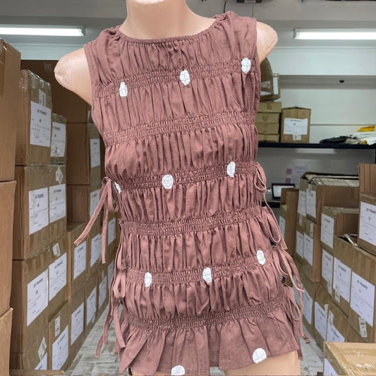 717-1 Choc Polka Dot Ruched Side Tie TopVendor:BY FRANKIE